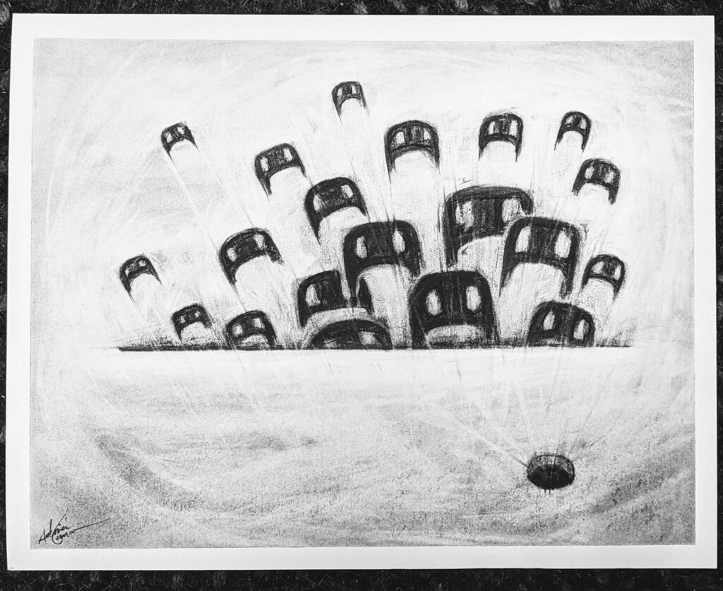 I shared a number of think piece articles rather brazenly to my professional network on LinkedIn around the turn of the year (2025–2026), using various original art pieces (including the one in this post) to support my points.